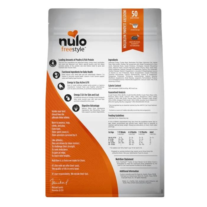 Nulo FreeStyle Turkey & Duck Dry Cat & Kitten Food is perfect for any feline, from growing kittens to adult cats. This grain-free recipe comes in a small, round shape that is easy for your cat to eat, with a soft texture they’ll enjoy. The combination of duck and turkey provides a protein-rich, gourmet combination that cats can’t resist.
