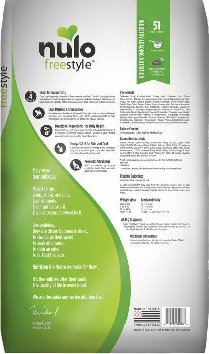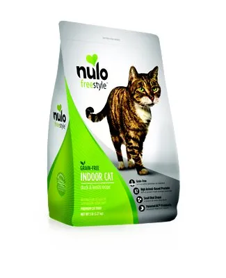Provide your feline friend with the nutrition she needs and deserves with Nulo Freestyle Duck and Lentils Grain-Free Indoor Dry Cat Food! Our cat companions require rich protein to stay fit and healthy which is why this kitty kibble is purr-fect with 82% of proteins coming from real meat including duck, chicken and turkey! Plus, your cat will be sure to get the amino acids she need to build strong muscles and bounce back from a day of play. This grain-free recipe is specially formulated with low-glycemic index ingredients and advanced probiotics to ensure that indoor cats get the best nutrition!