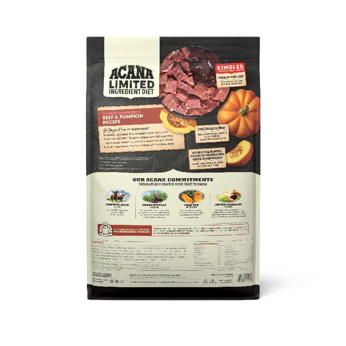 Acana Singles Beef & Pumpkin Recipe features 65% premium beef ingredients balanced with whole pumpkin, supporting digestive health and providing a complete, limited-ingredient diet for dogs. Grain-free and protein-rich, this biologically appropriate recipe helps nourish dogs naturally.