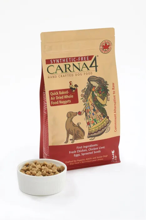 Carna4 Chicken variety is whole food nutrition for all life stages of your dog. Our Canadian-made pet food starts with 100% fresh chicken (we use the muscle & flesh, not by-products) plus chicken liver & eggs. No meat or vegetable meals, ever. We then add clean, de-boned Atlantic salmon, whole produce, our certified organic sprouted seeds and nutrient-rich kelp. We then quick-bake & gently dry it to give your dog highly digestible vitamins and minerals, without synthetic additives of any kind. No vitamin pre-mix needed, ever.