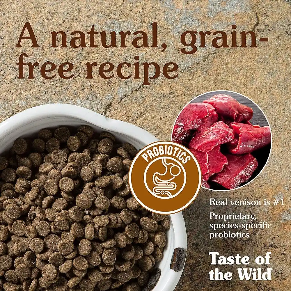 *Pasture-Raised Venison* โ Venison, the number one ingredient in this formula, is rich in nutrients and energy, and a highly digestible source of protein. *Species-Specific Probiotics* โ Healthy digestive and immune systems are vital to the overall health of your pet. Our proprietary K9 Strain Probiotics are developed specifically for dogs and added after the cooking process to ensure viability. Each pound of Taste of the Wild provides 80 million live, active cultures that help support healthy digestive and immune systems. *Legumes* โ These nutrient-dense ingredients, including garbanzo beans, peas, lentils and fava beans, are excellent sources of protein, fiber and carbohydrates. *DHA* โ This omega-3 fatty acid, provided by salmon oil, helps support brain and vision development in puppies, which makes it an important addition to this all life stages formula. *Dried Chicory Root* โ This source of prebiotic fiber provides fuel for the beneficial probiotic bacteria in the digestive system. *Antioxidants* โ Legumes and fruits, including peas, lentils, tomatoes, blueberries and raspberries, provide nutrients that help support your dogโs overall well-being while guaranteed levels of zinc, selenium and vitamin E support the immune system.