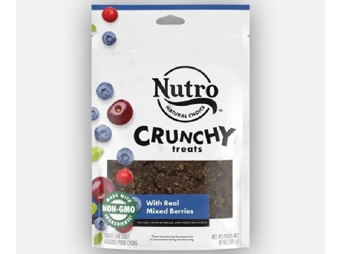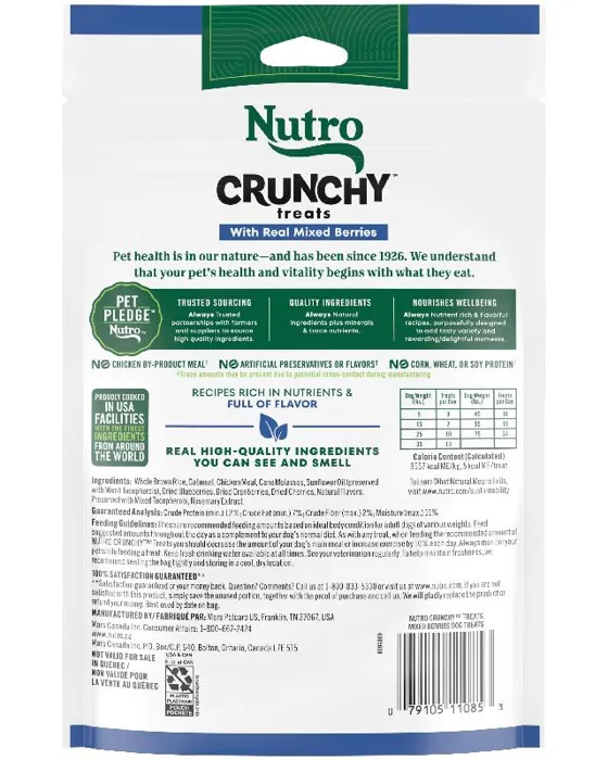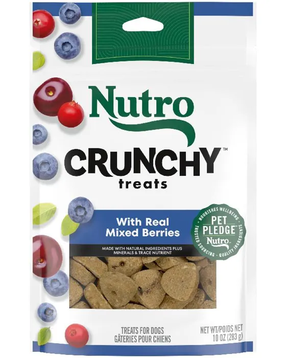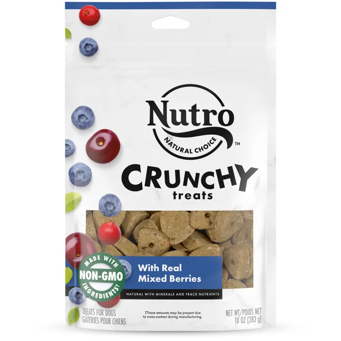 Dogs love the crunchy texture and natural flavors of NUTRO Crunchy Dog Treats. These 100% natural dog treats are made with non-GMO ingredients*, containing: NO chicken by-product meal, NO artificial flavors or colors, NO artificial preservatives, NO corn, wheat, or soy protein. Our NUTRO Treats for Dogs with Real Mixed Berries are thoughtfully prepared to give your canine companion a delicious, healthy bite-size snack, to reward an active and healthy lifestyle. * Trace amounts of genetically modified material may be present due to cross contact during manufacturing.